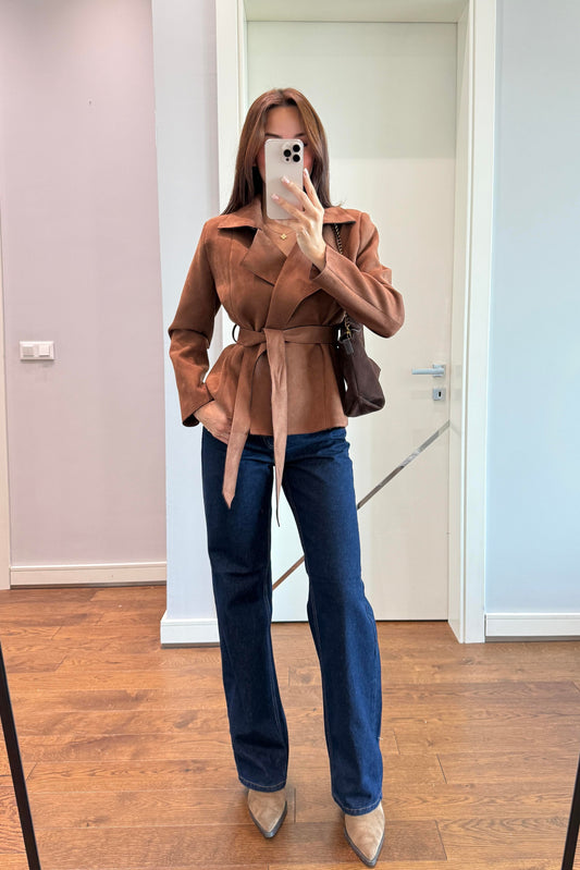KRUVAZE KEMER DETAYLI SÜET CEKET-KAHVERENGİ