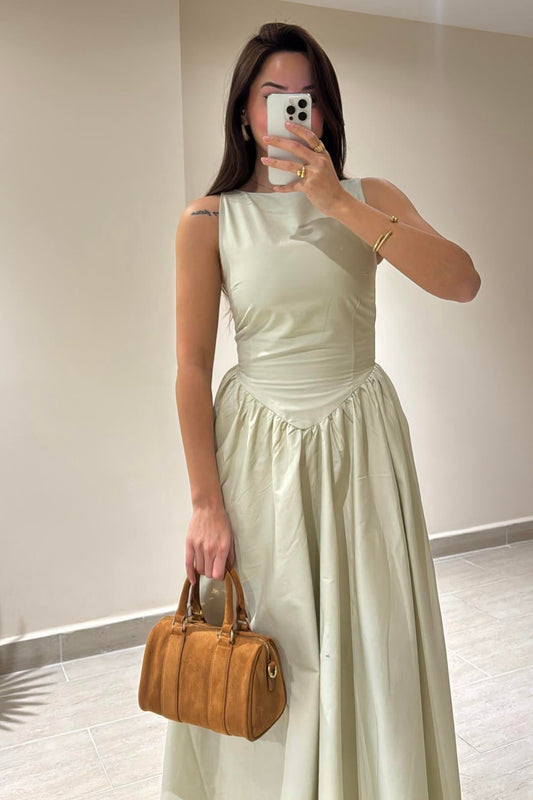 YEŞİL BEL DEKOLTELİ ELBİSE