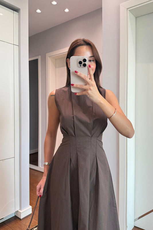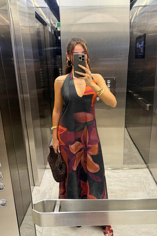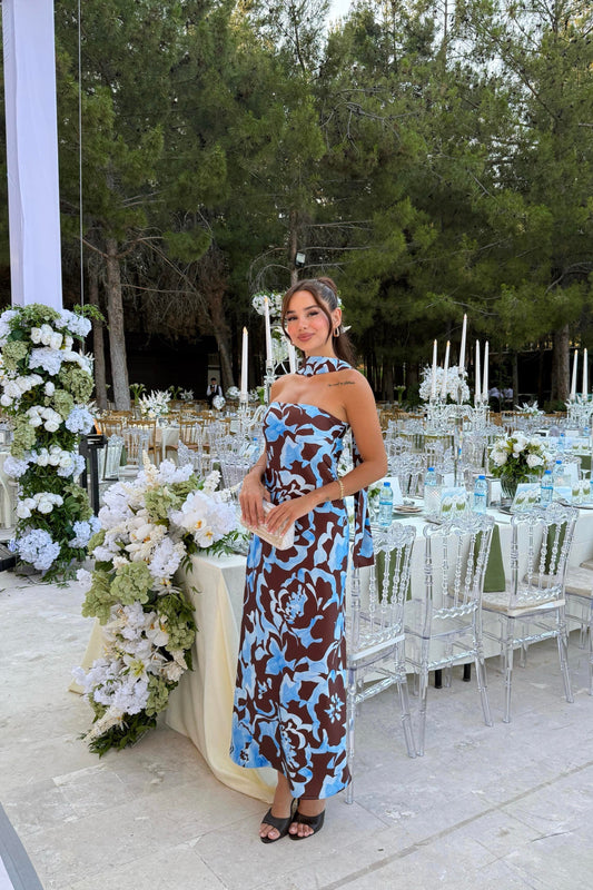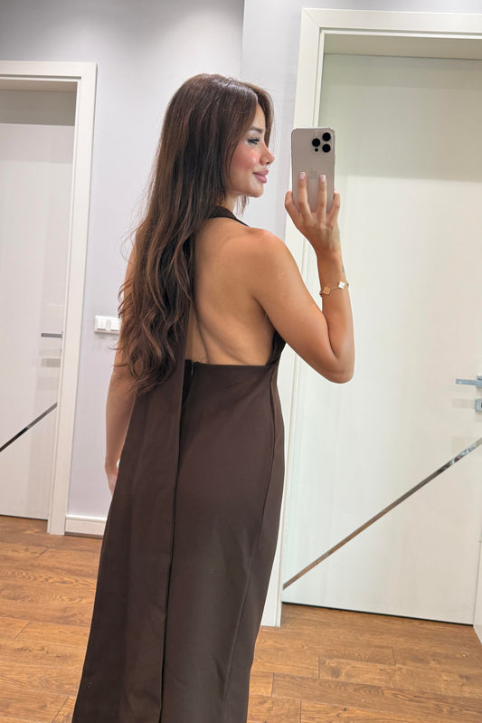 HALTER YAKA DEKOLTELİ ELBİSE-KAHVERENGİ