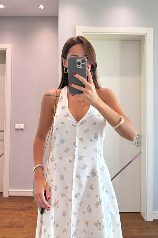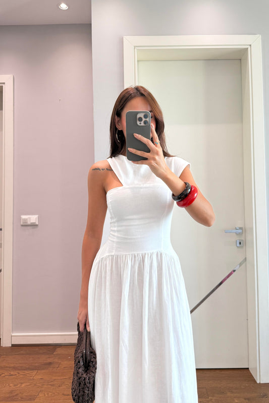 OMUZ DETAYLI BEYAZ KETEN ELBİSE