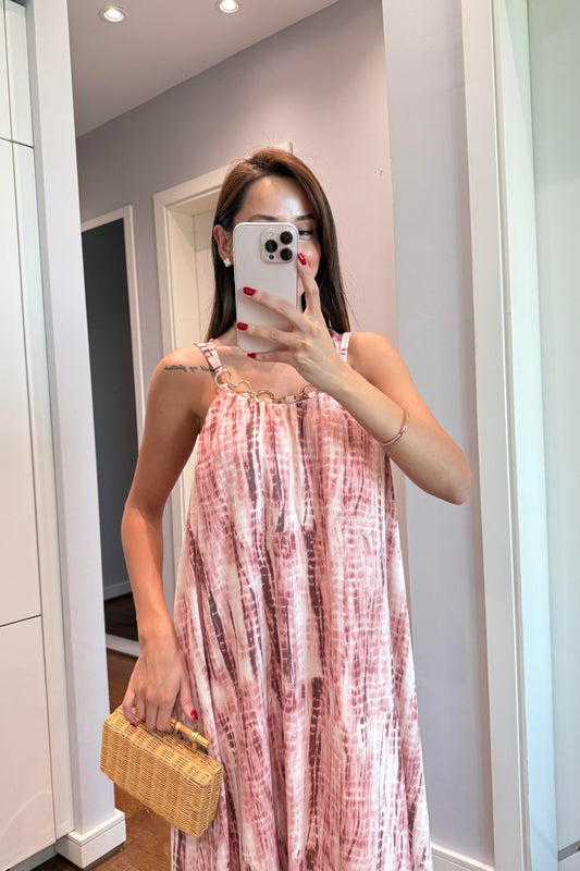 BOYUNDAN KUŞAKLI TASARIM DESENLİ ELBİSE