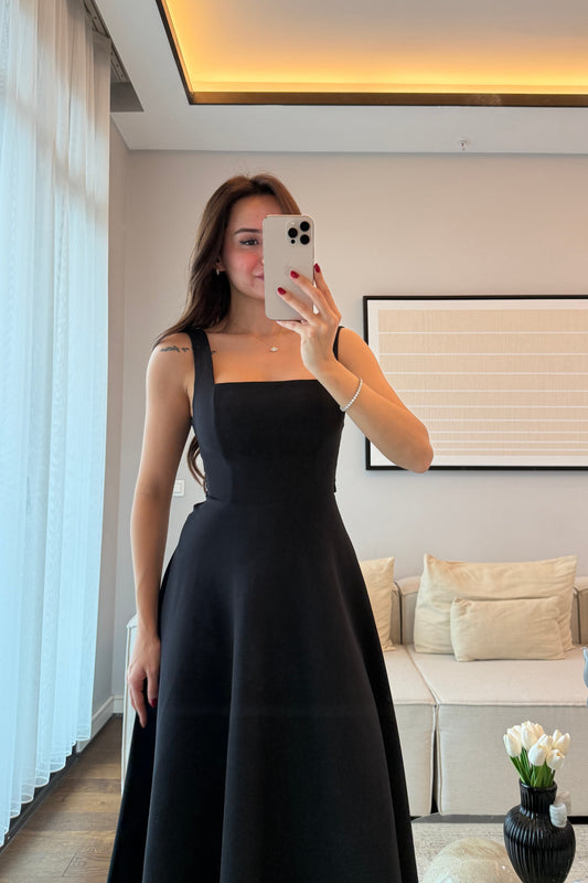 ARKADAN BAĞLAMALI VOLANLI ELBİSE-SİYAH