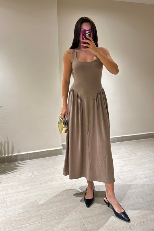 BEL DETAYLI KAHVERENGİ TASARIM ELBİSE