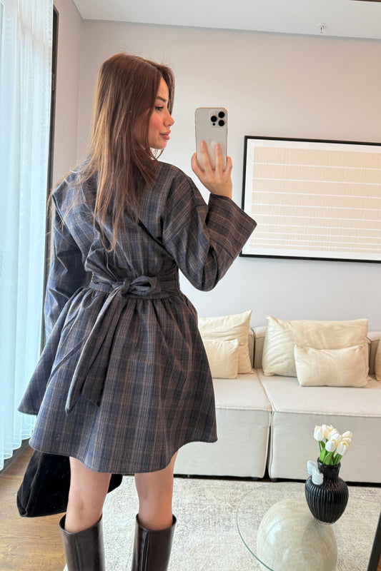 AKSESUAR DETAYLI BELDEN OTURMALI MİNİ ELBİSE-GRİ