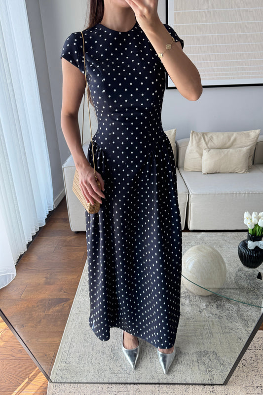 BELDEN OTURTMALI PUANTİYE DESEN ELBİSE-LACİVERT
