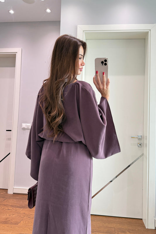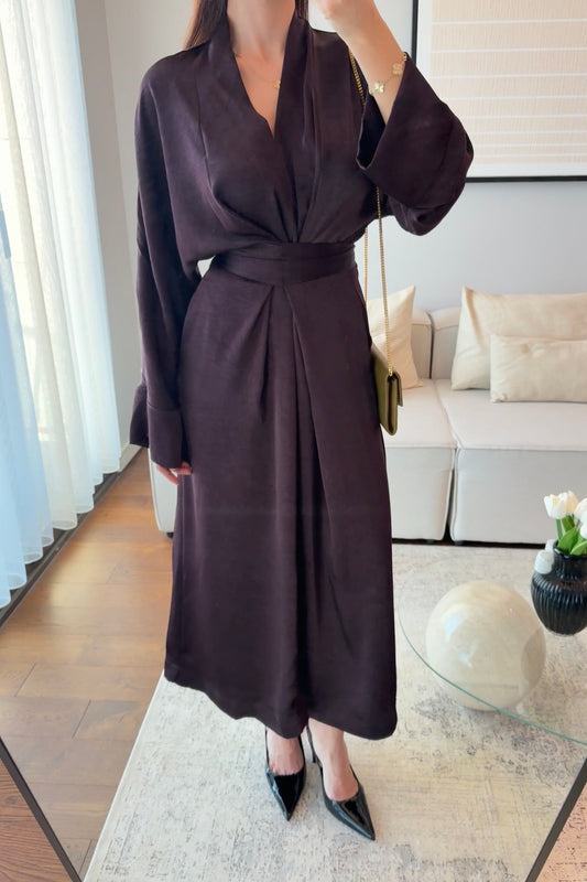 KRUVAZE YAKA BELDEN KUŞAKLI DÖKÜMLÜ MAXİ ELBİSE-MÜRDÜM