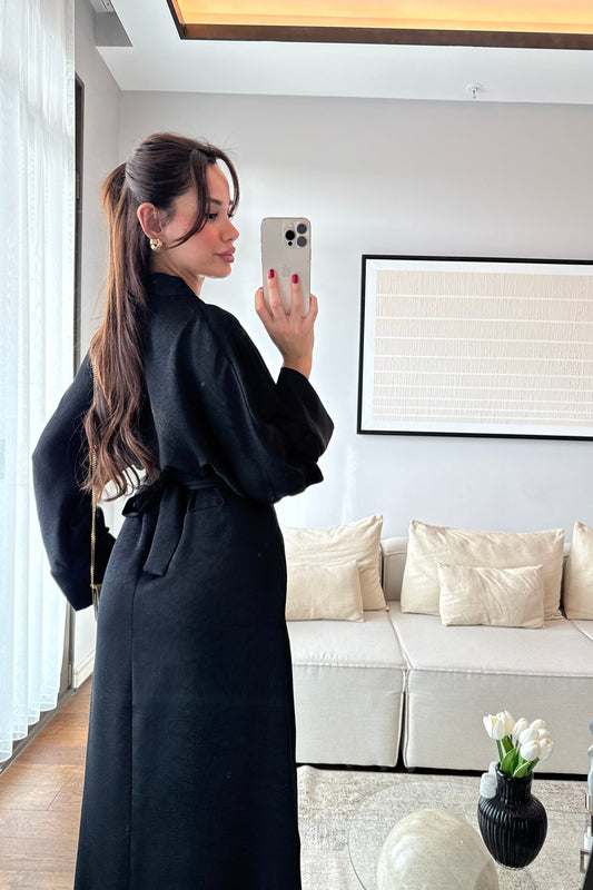 KRUVAZE YAKA BELDEN KUŞAKLI DÖKÜMLÜ MAXİ ELBİSE-SİYAH