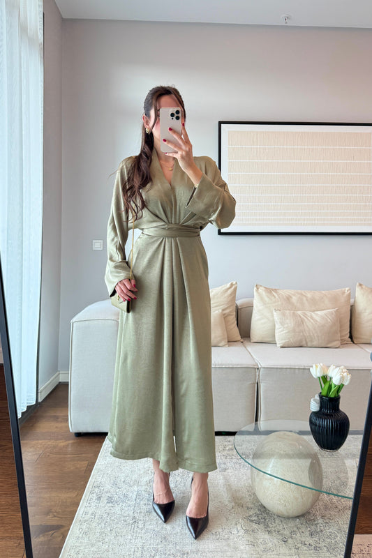 KRUVAZE YAKA BELDEN KUŞAKLI DÖKÜMLÜ MAXİ ELBİSE-HAKİ