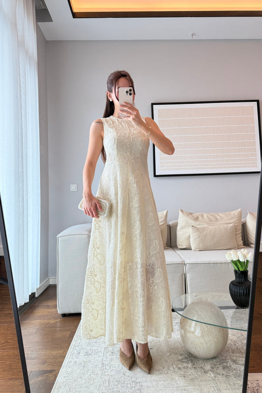 PERİ BRODELİ SIFIR KOLLU ELBİSE-BEJ