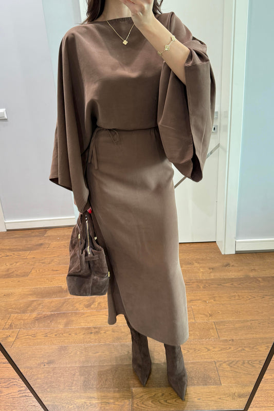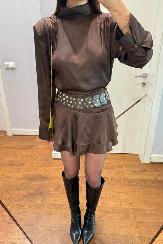 3 AL 2 ÖDESATEN DİK YAKA BLUZ KEMERLİ ETEK TAKIM-KAHVE