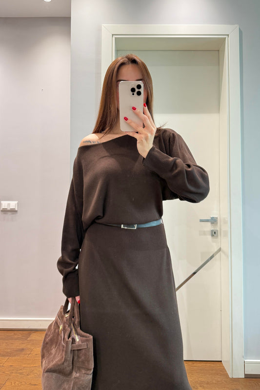 TRİKO KEMERLİ ELBİSE-KAHVE