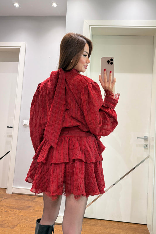 VATKALI DANTEL DETAYLI BAĞLAMALI ELBİSE-KIRMIZI