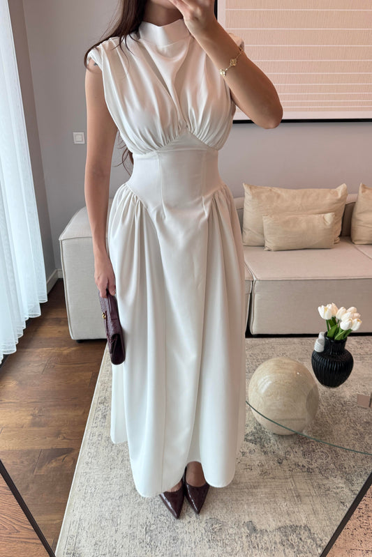 VATKALI OMUZ DRAPELİ BEL DETAYLI MAXİ ELBİSE