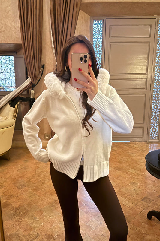 PELUŞ DETAYLI KAPÜŞONLU TRİKO HIRKA-EKRU