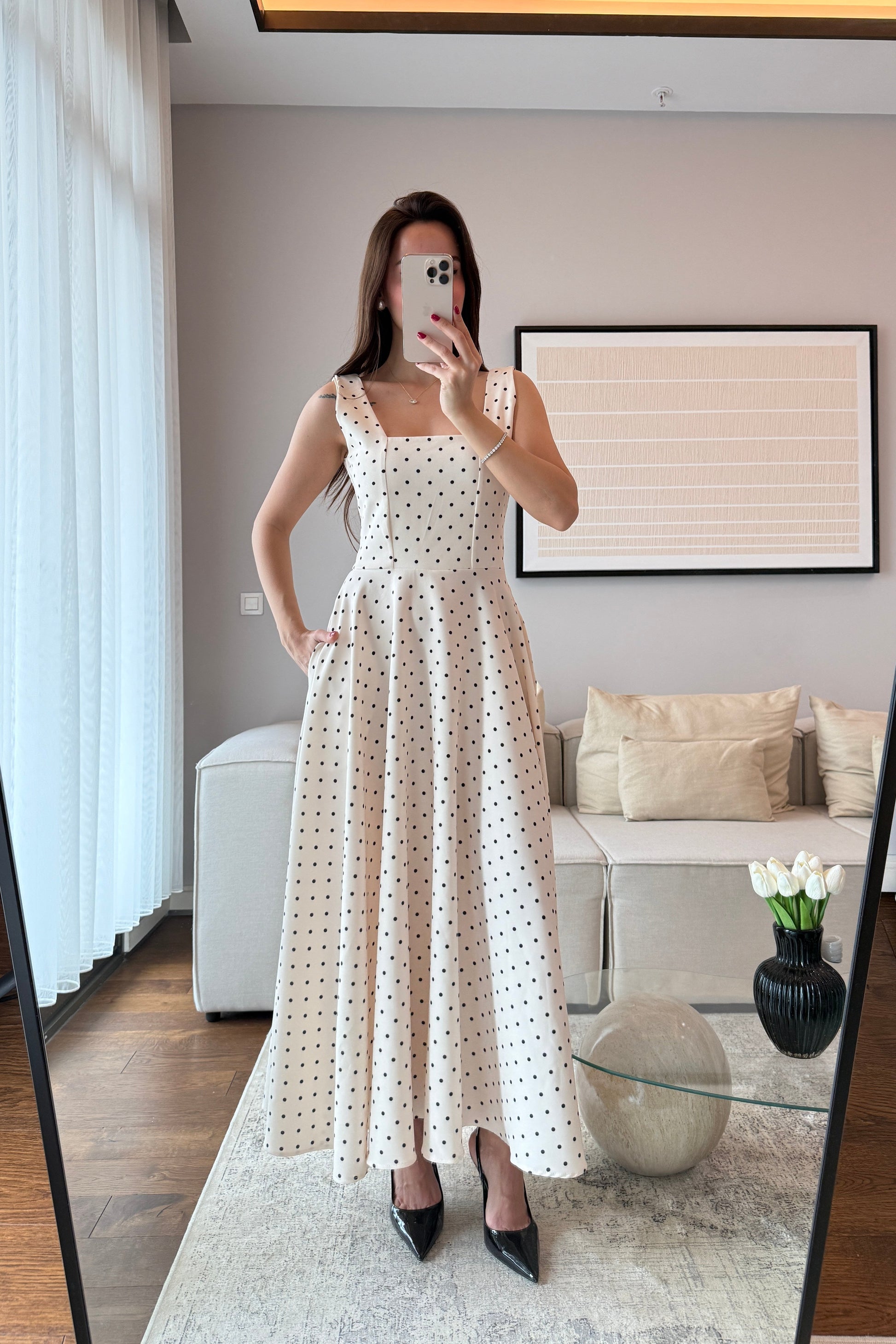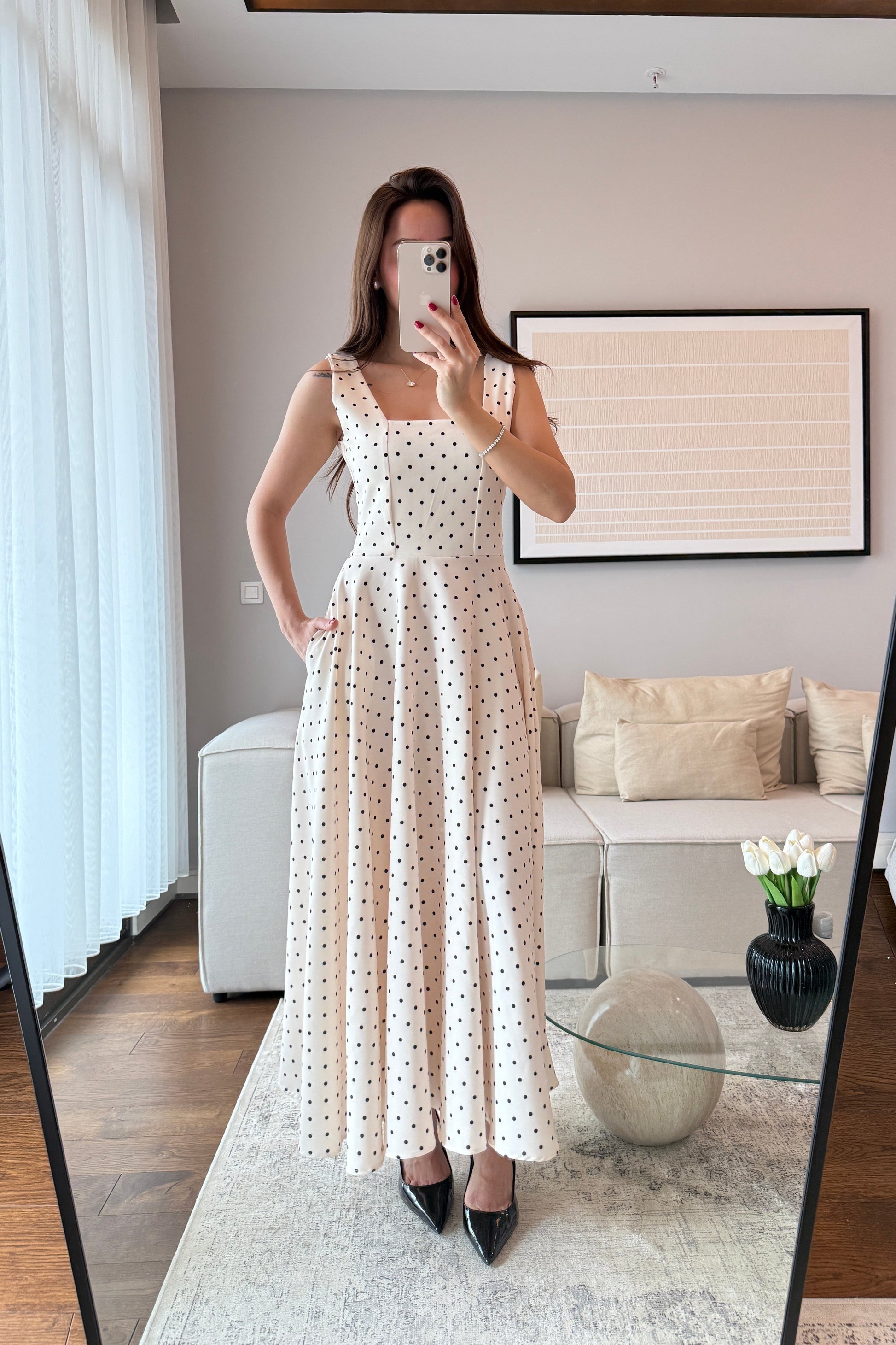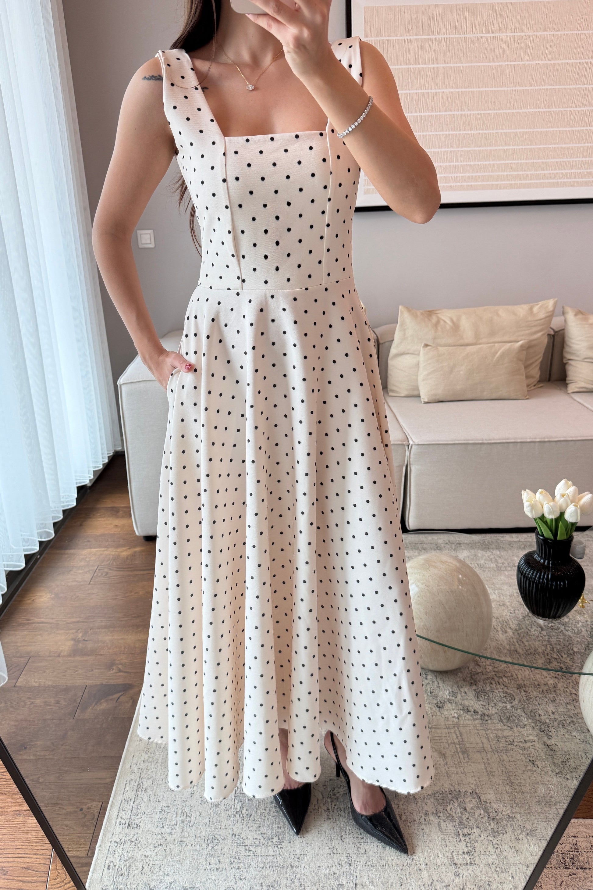 ARKADAN BAĞMA DETAYLI PUANTİYE ELBİSE-EKRU