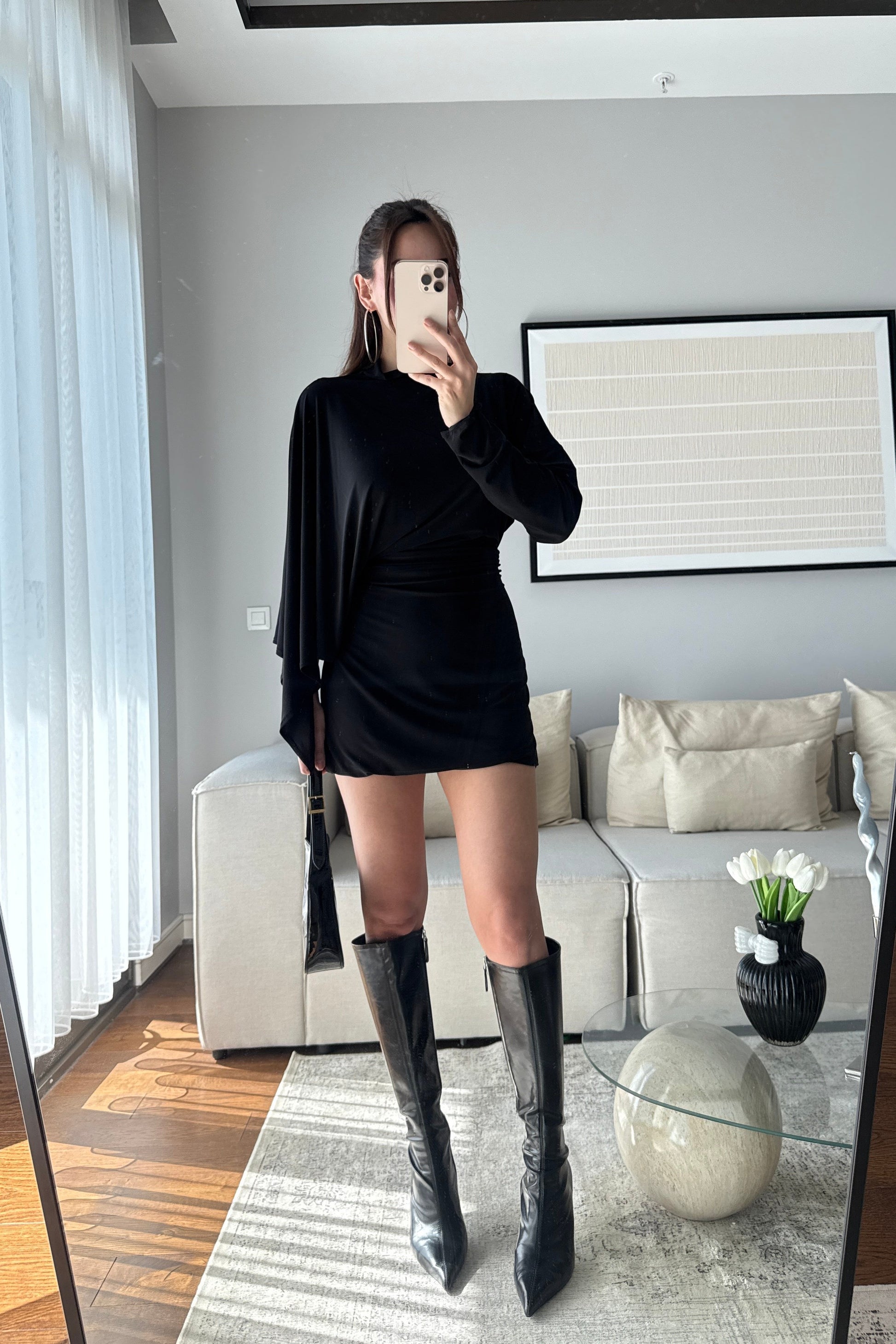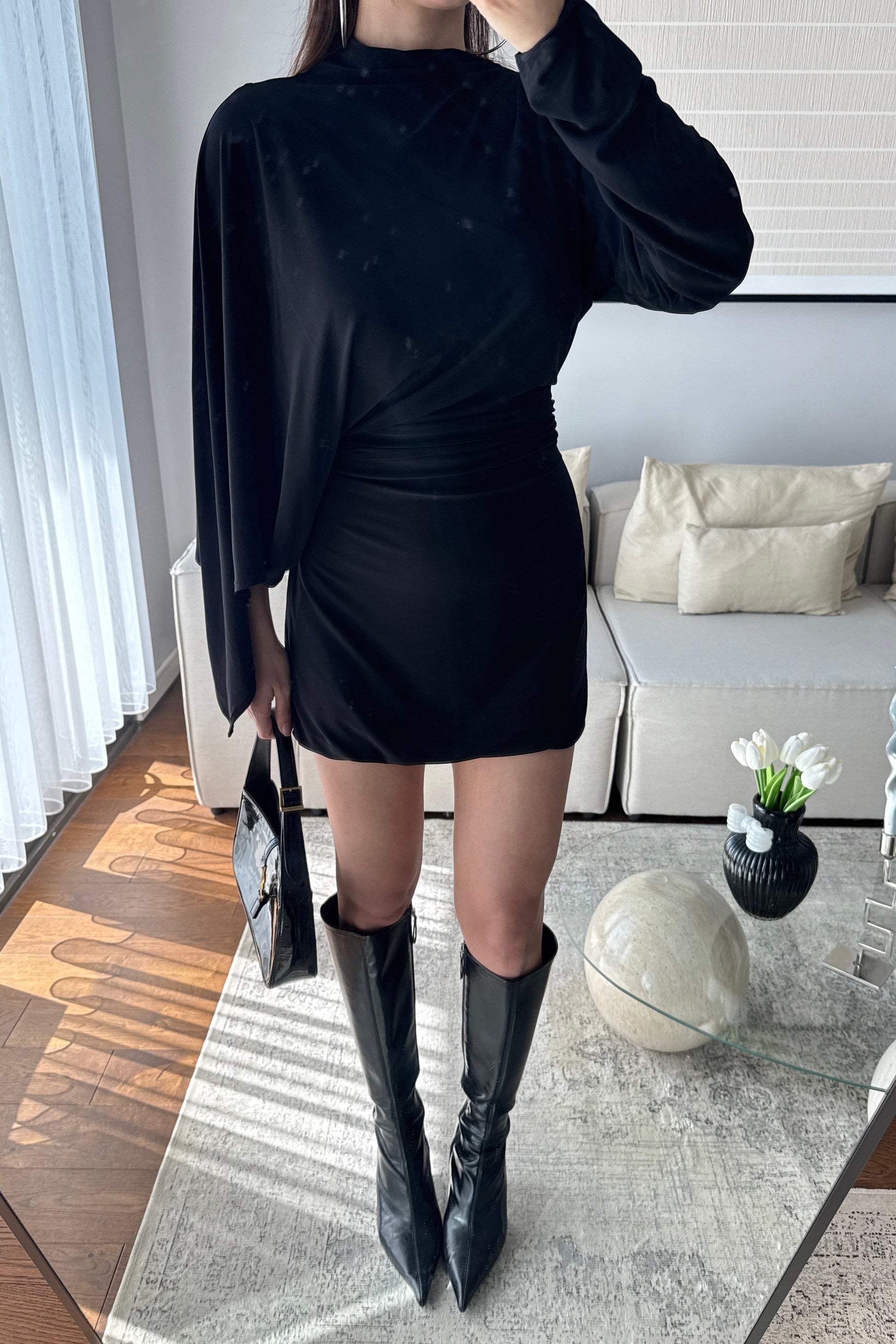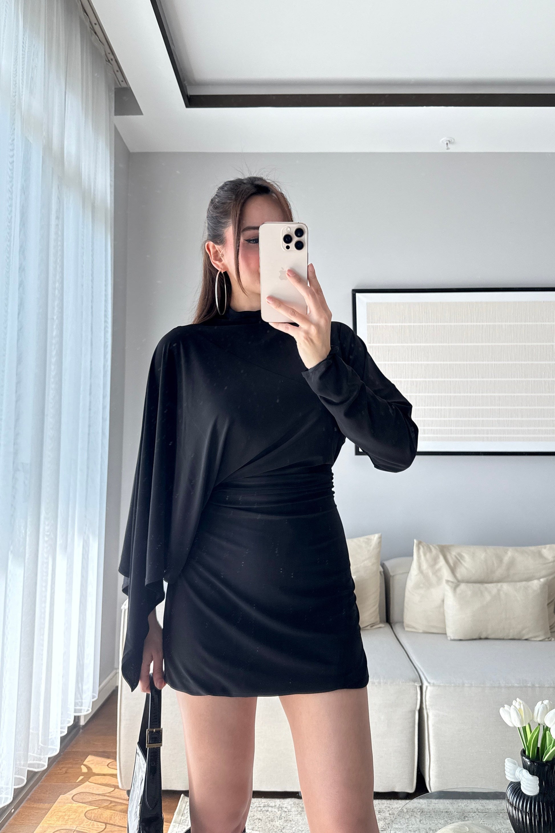 ASİMETRİK KESİM DRAPELİ ELBİSE-SİYAH