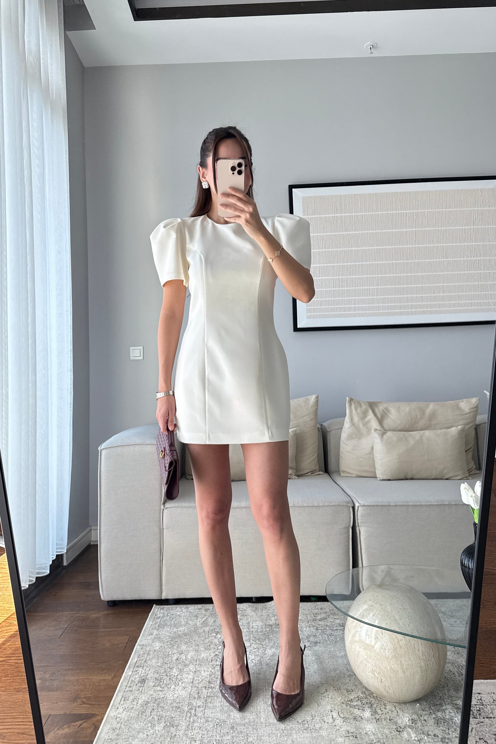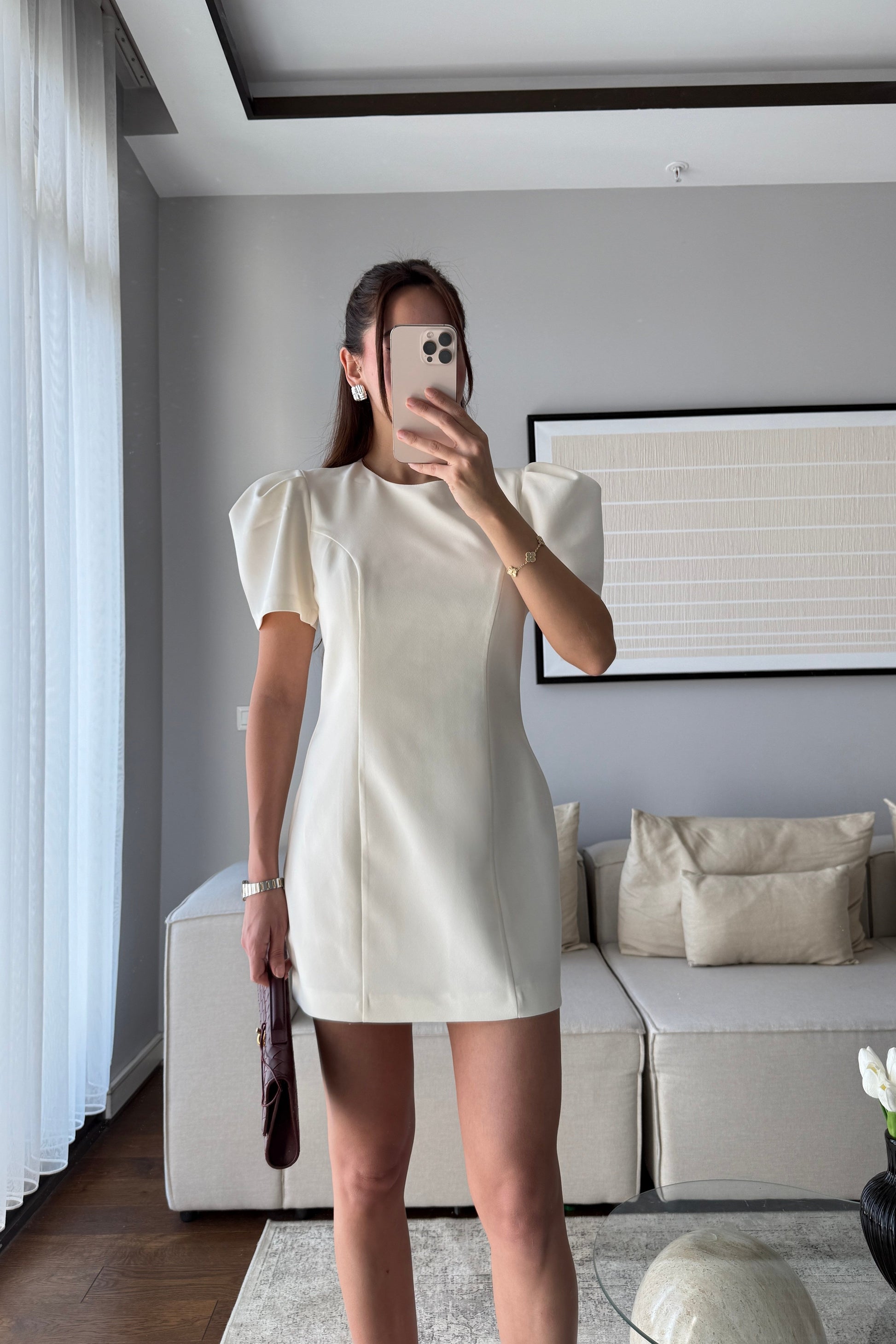 BALON KOLLU MİNİ ELBİSE-EKRU