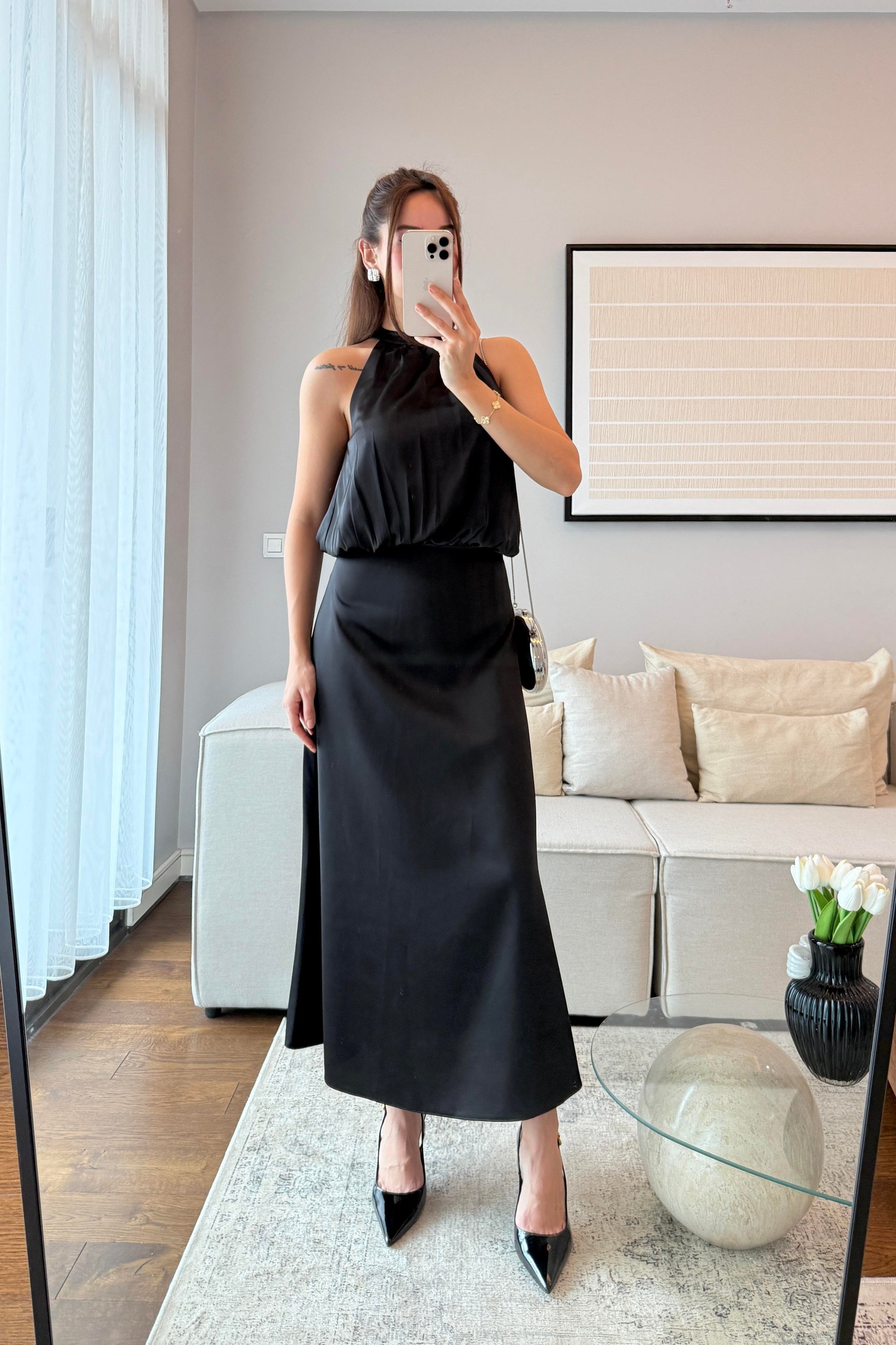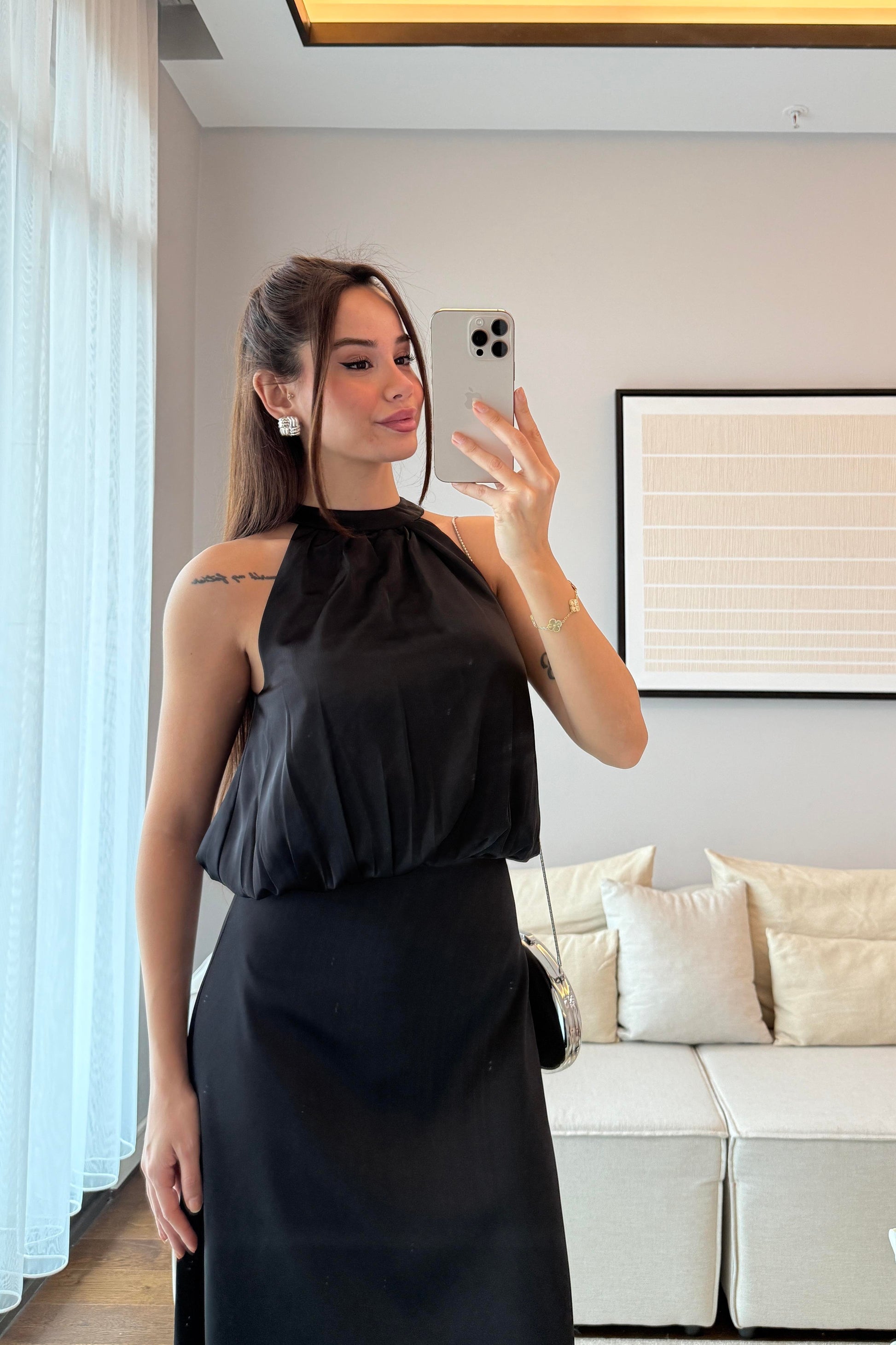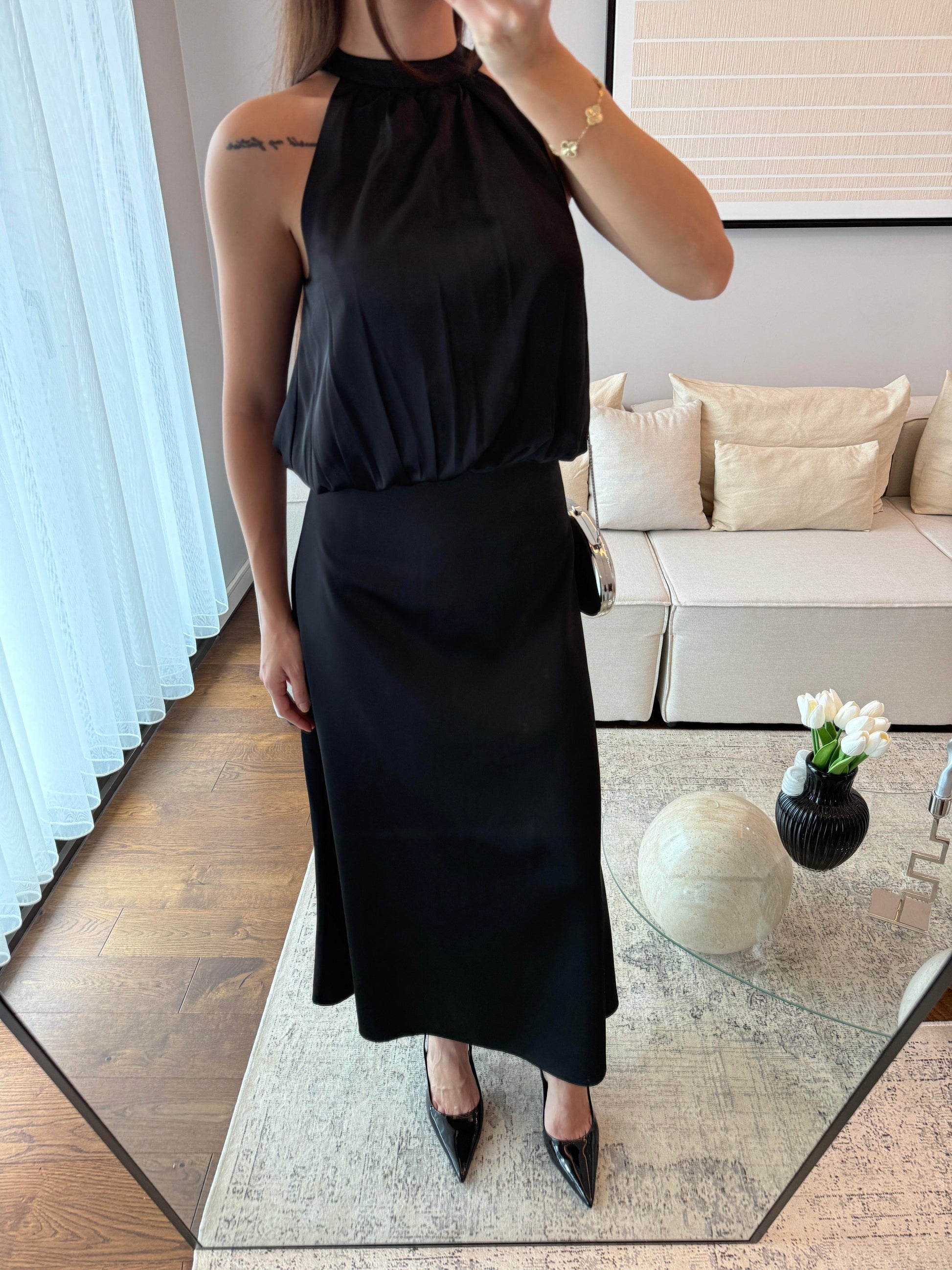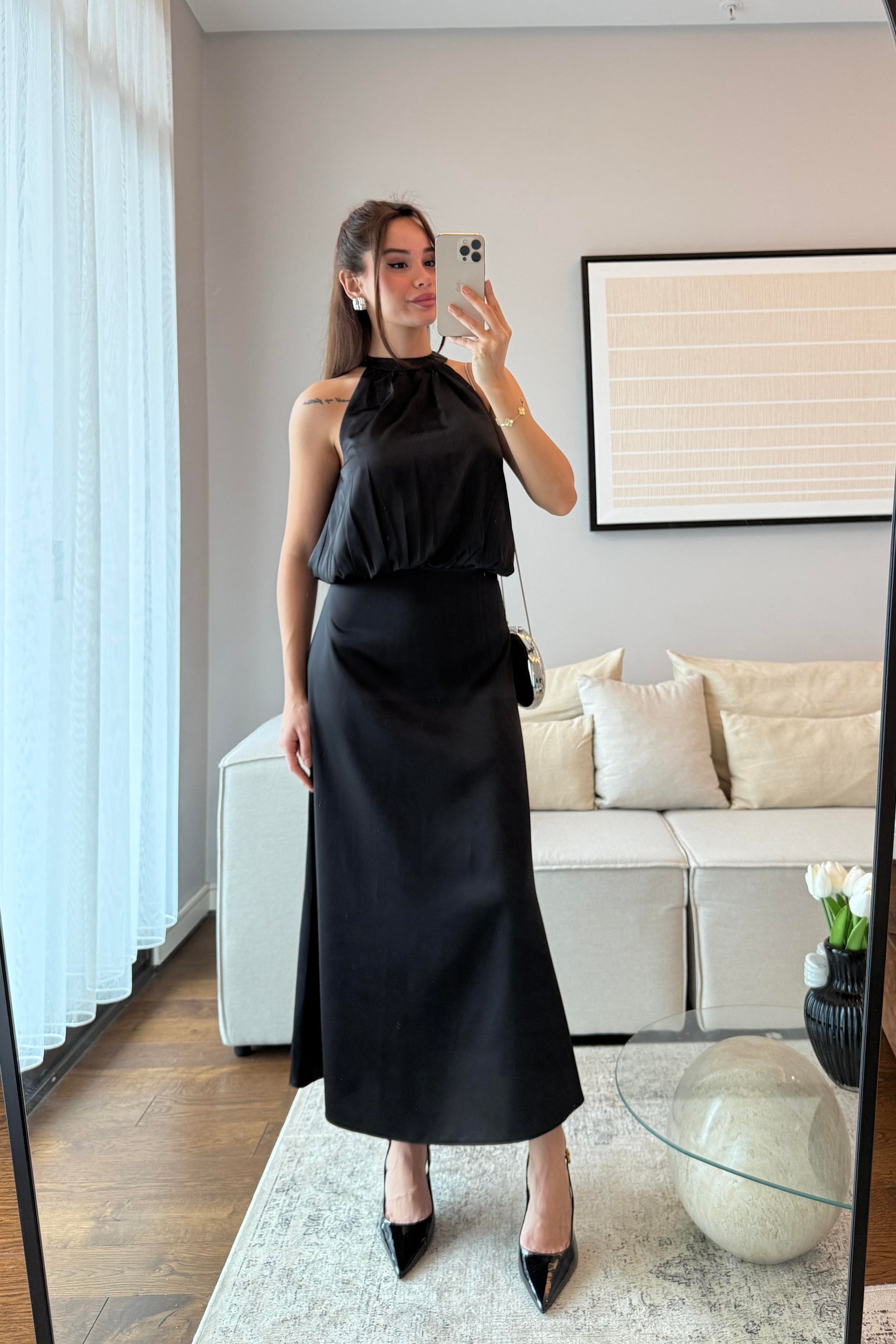 HALTER YAKA DÖKÜMLÜ ELBİSE-SİYAH