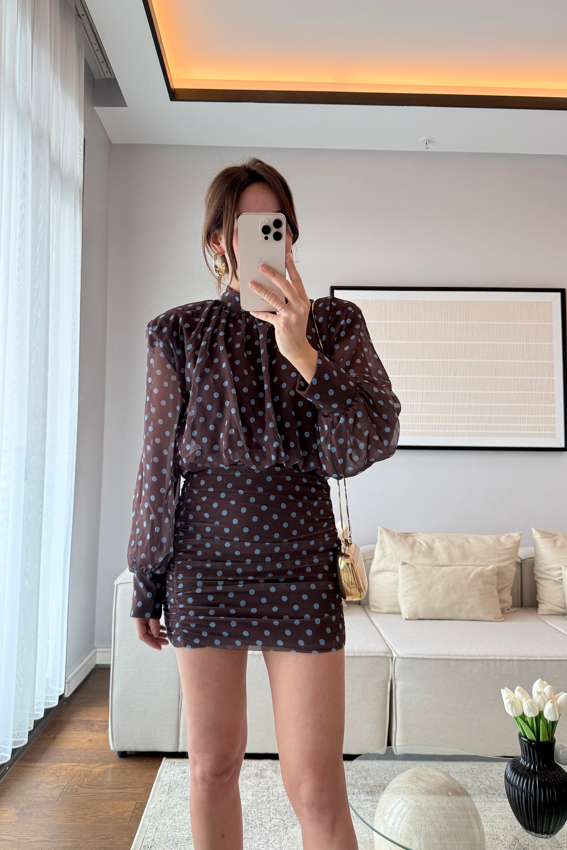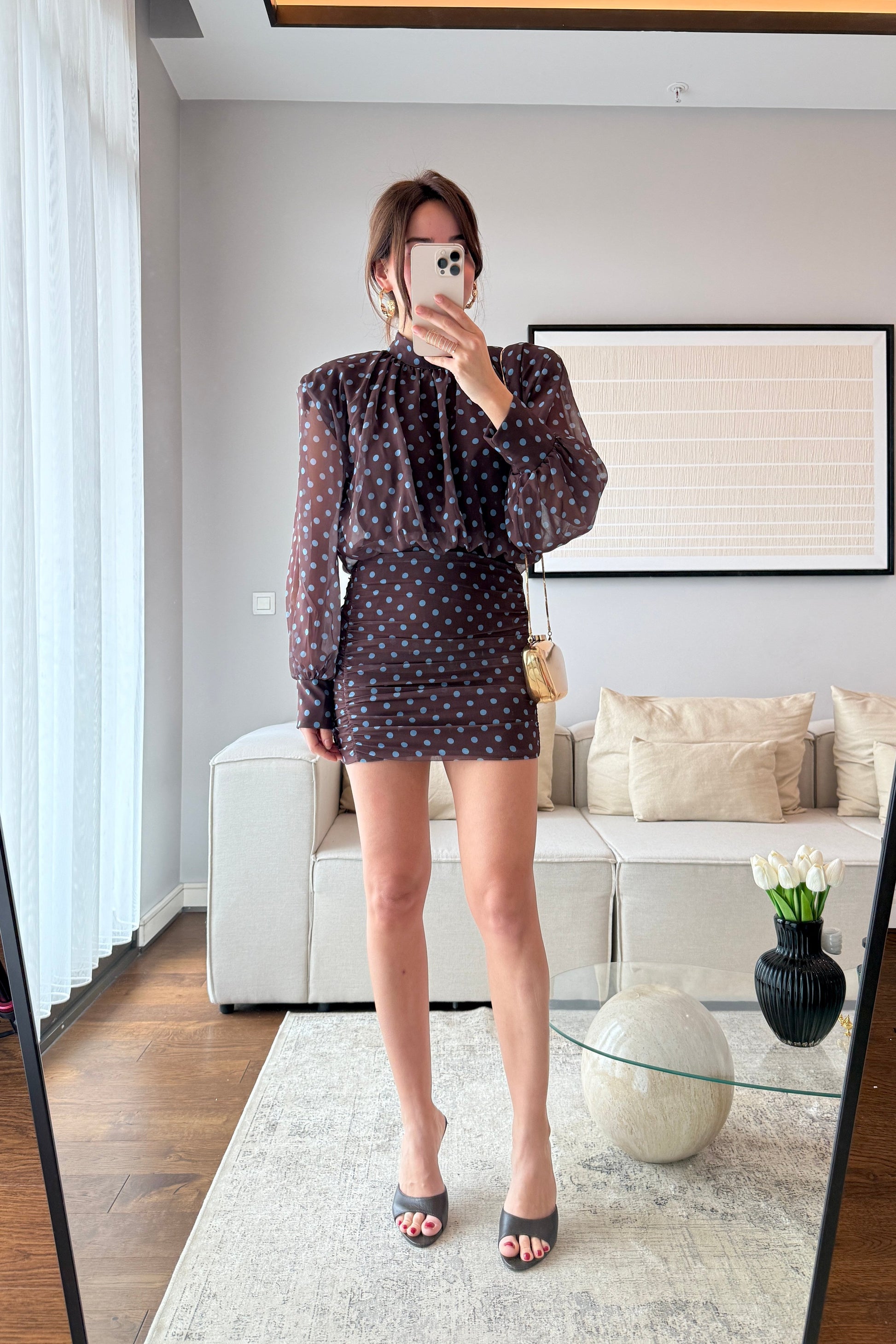 SIRT DEKOLTELİ VATKALI PUANTİYELİ ELBİSE -KAHVE