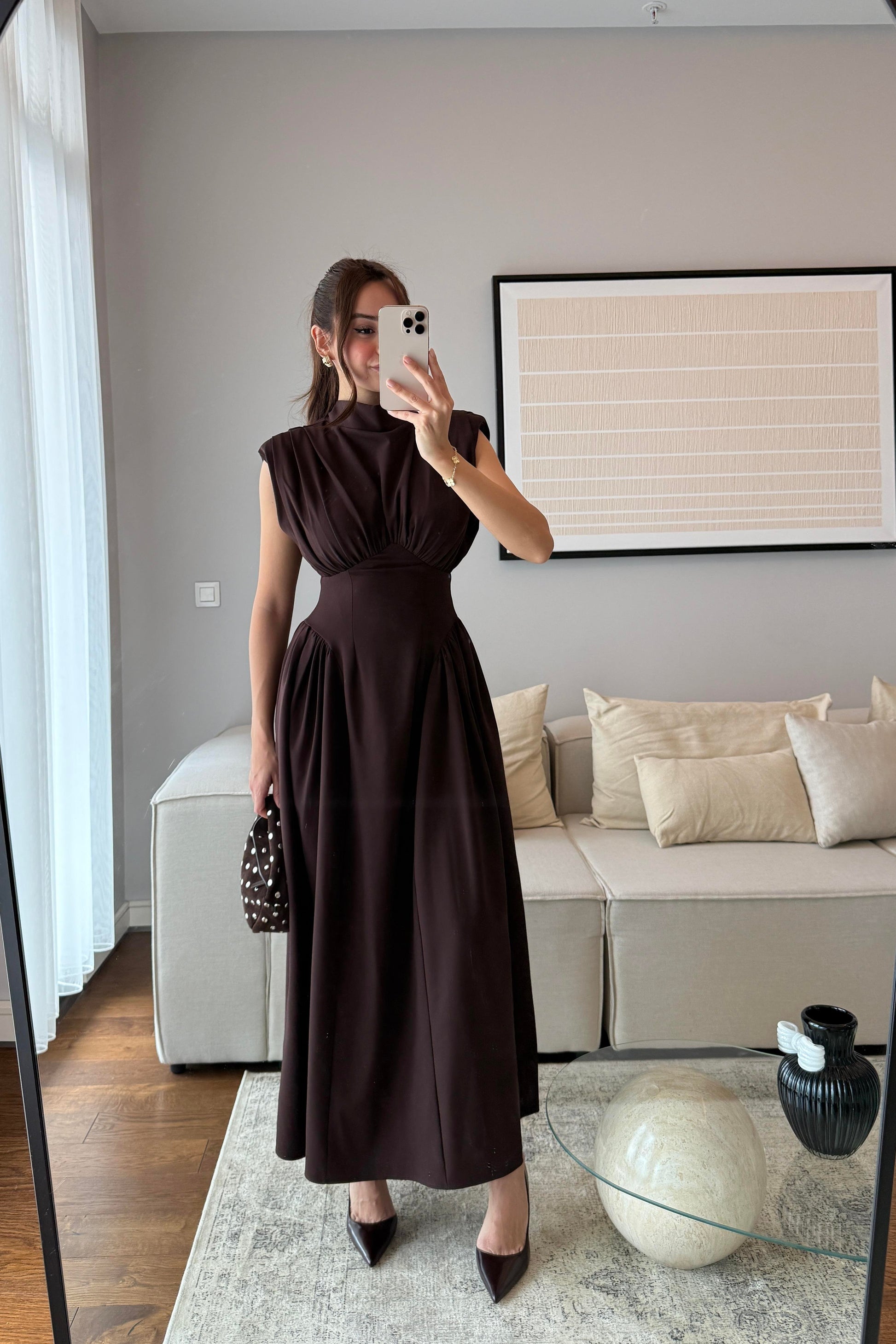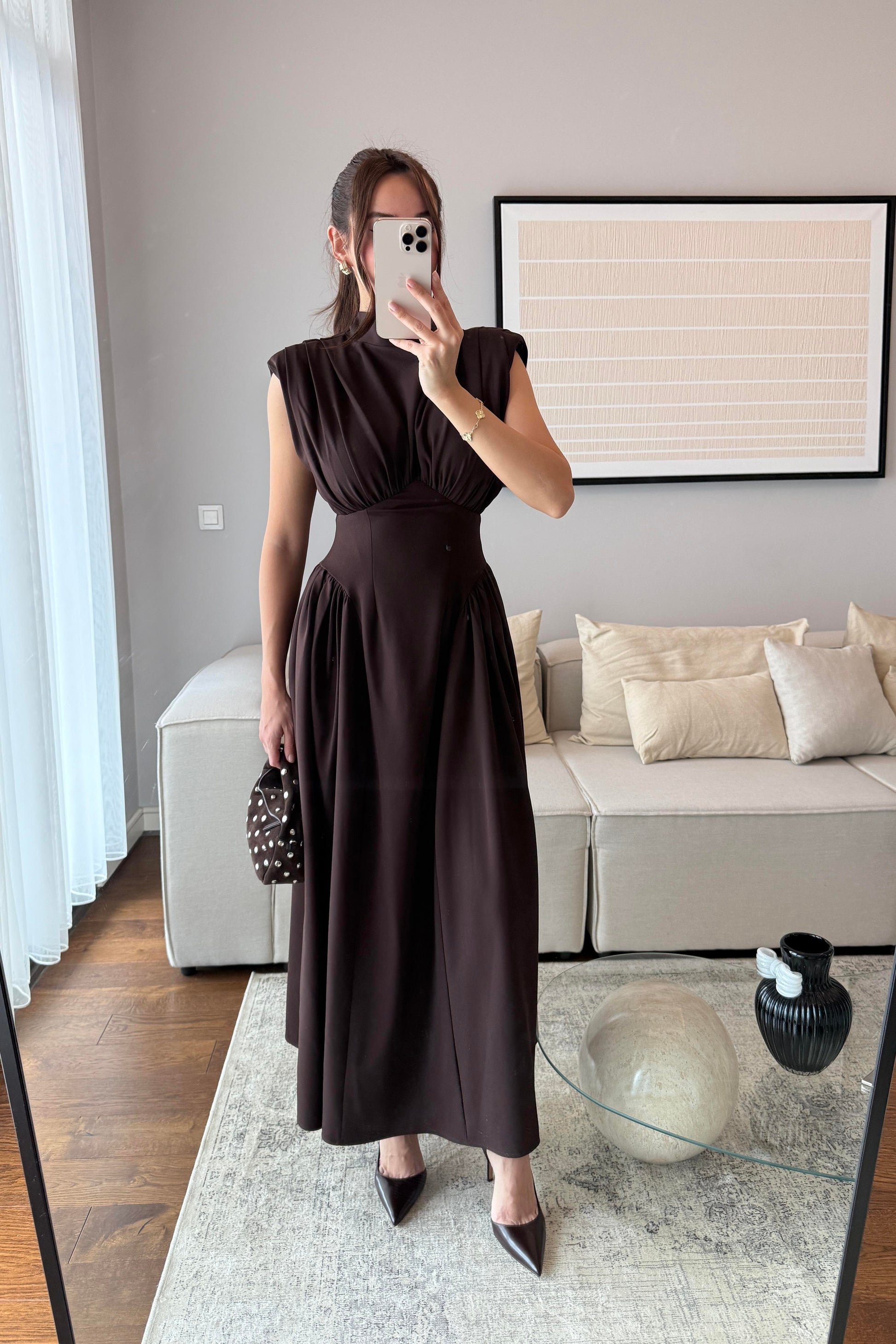 VATKALI OMUZ DRAPELİ BEL DETAYLI MAXİ BOY ELBİSE-ACI KAHVE