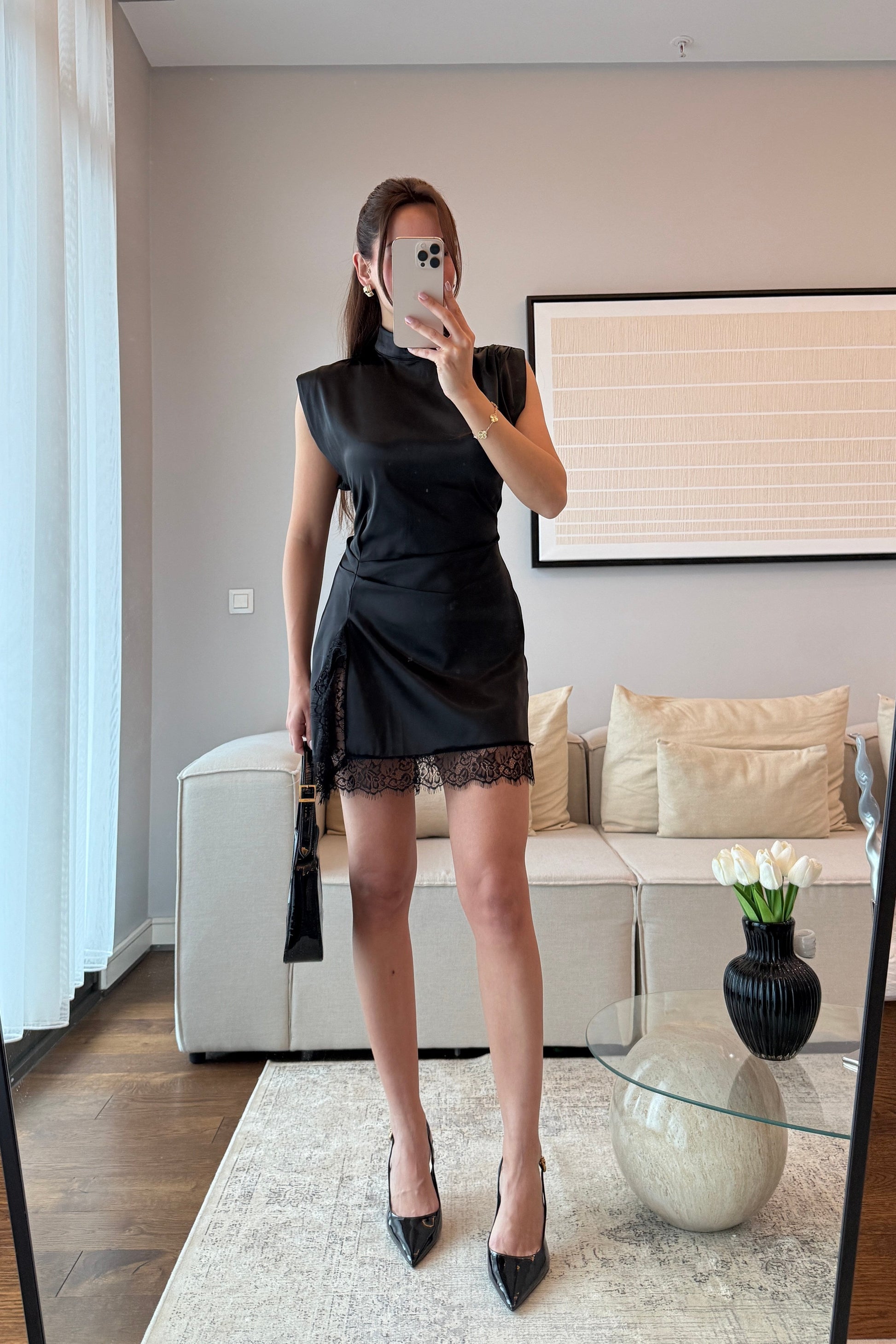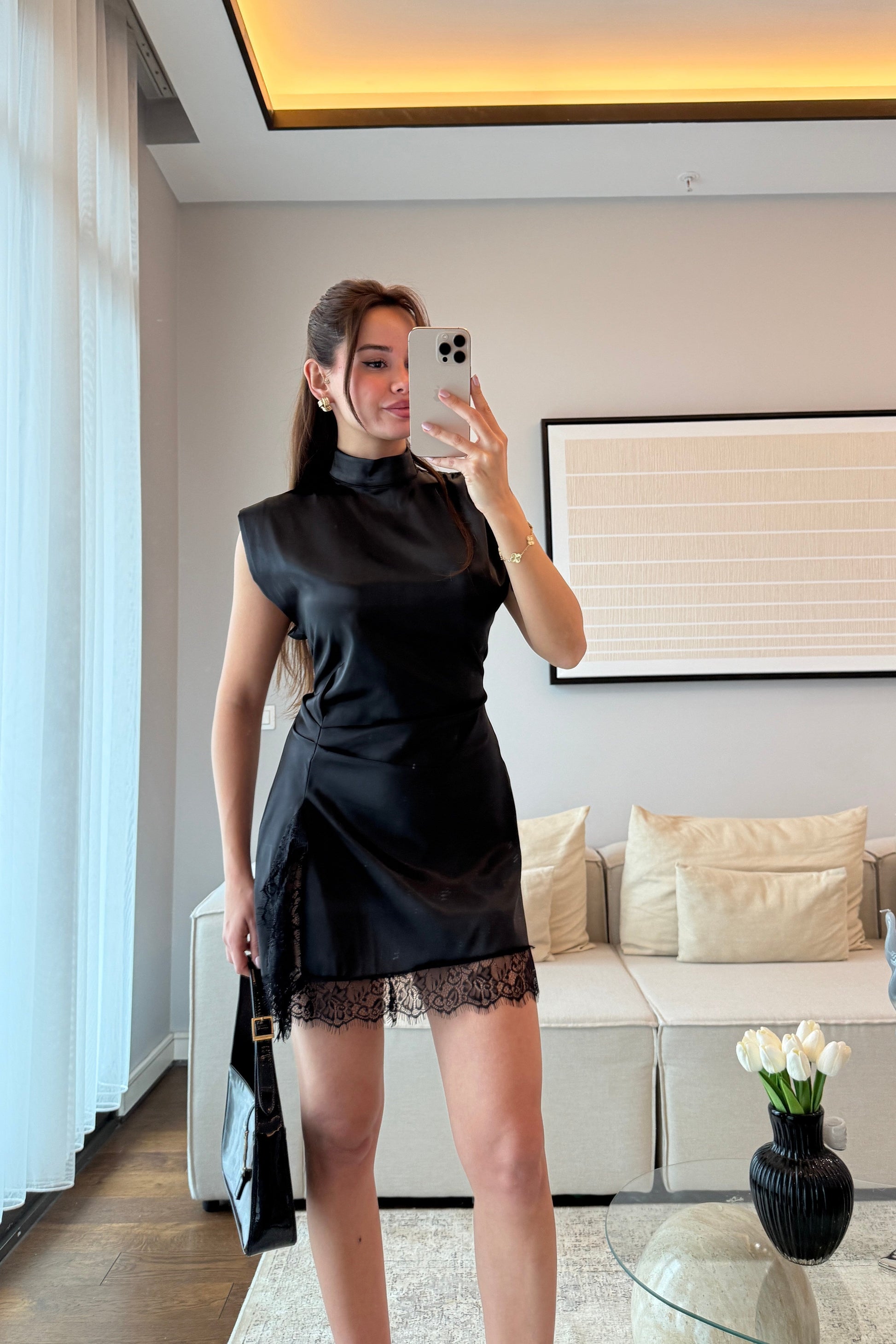 YIRTMAÇ DANTEL DETAYLI SATEN ELBİSE-SİYAH